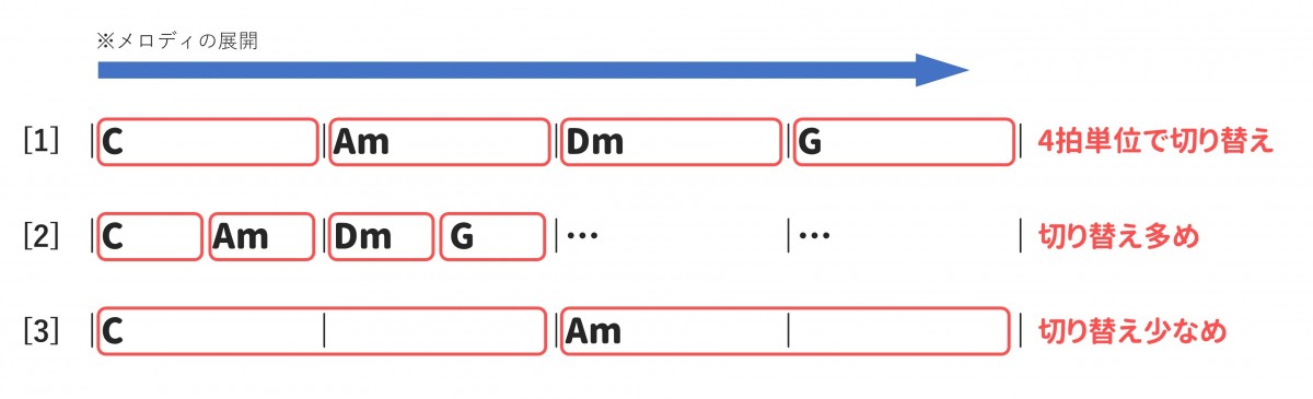 一般的には、上記図の1のように、メロディに対するコードが一小節(4拍)単位で切り替わっていくような展開をすんなりとイメージできるはずです。