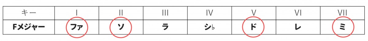 またこのとき、同じような観点から「『Fメジャーキー』ではないか?」という予測も立てられます(Fメジャーキーにも「ド」「ミ」「ファ」「ソ」が含まれているため)。※以下表