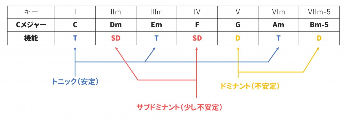 その分類は、具体的には「トニック(安定)」「ドミナント(不安定)」「サブドミナント(少し不安定)」の3種で、例としてこれを「キー=Cメジャー」の「Cメジャーダイアトニックコード」で示すと、以下のようになります。